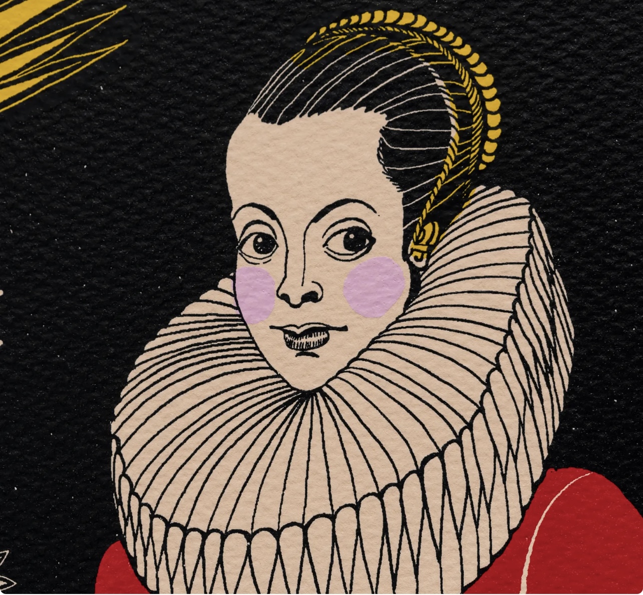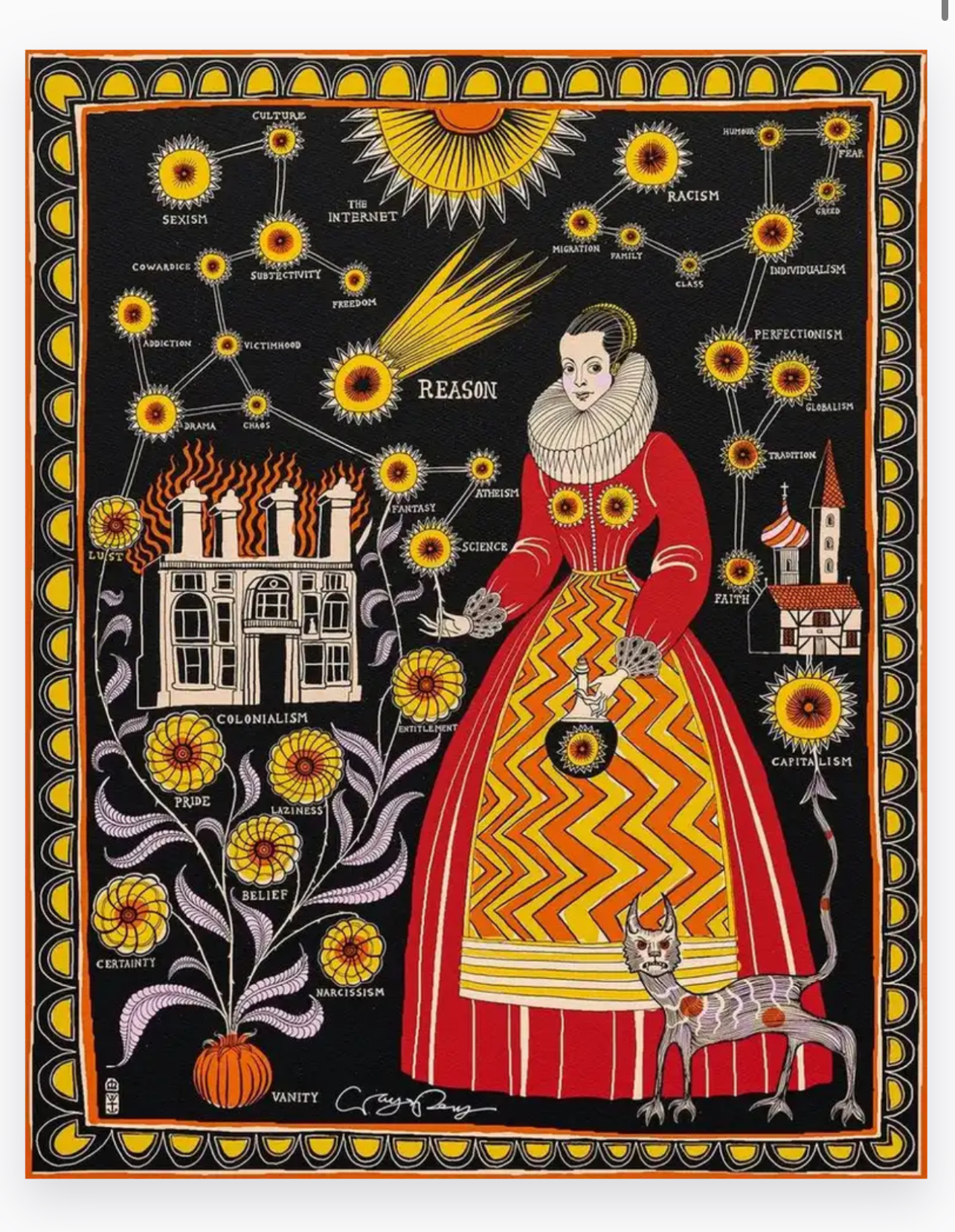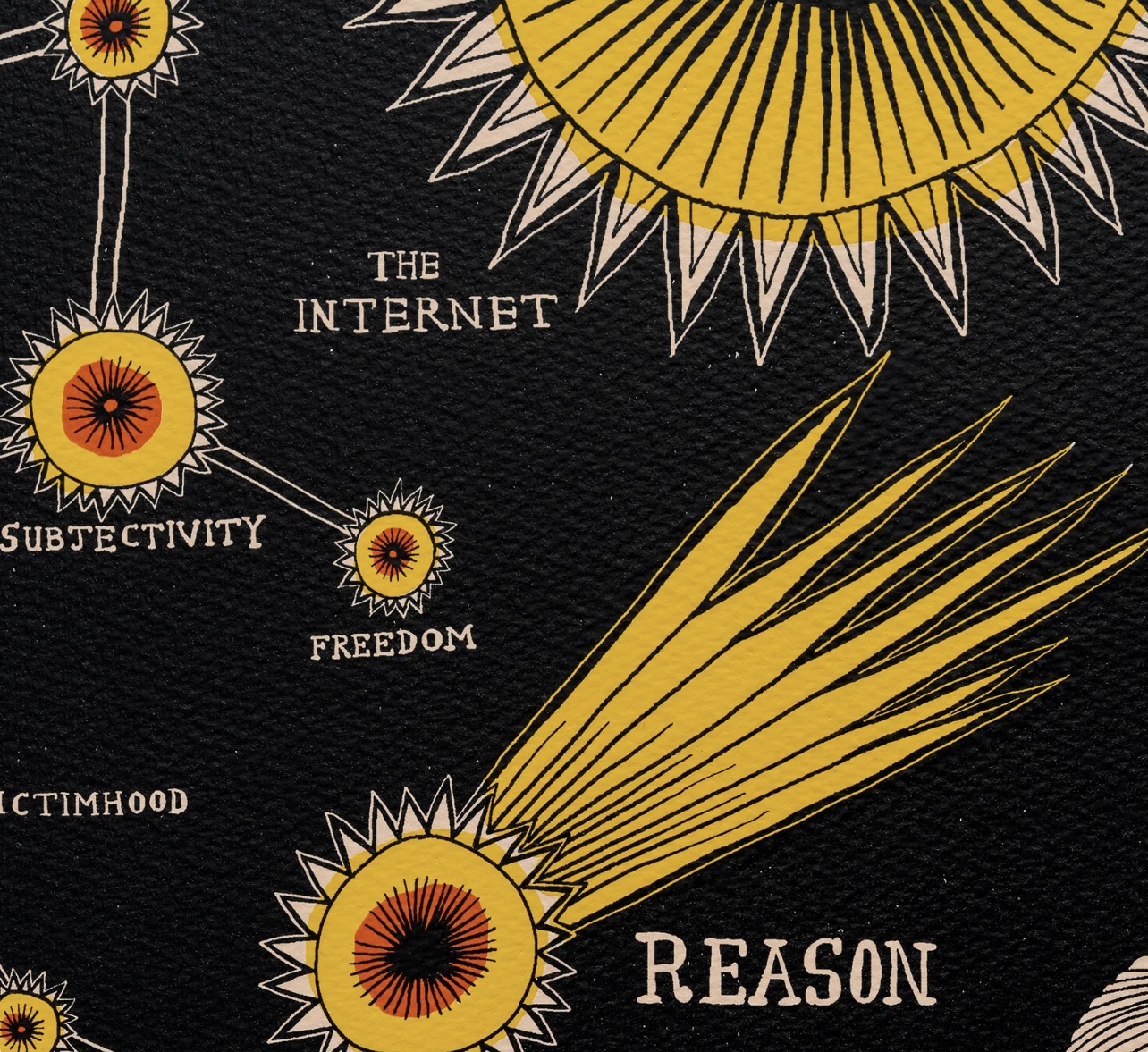 Magical Thinking began when Grayson encountered a painting by Cornelis de Vos at the Wallace Collection in London. In a graphic composition inspired by traditional Russian lubki, he surrounds his own version of de Vos’ unidentified subject with a constellation of words and symbols. The work’s title references the layer of mystical subjectivity through which we each engage with reality.