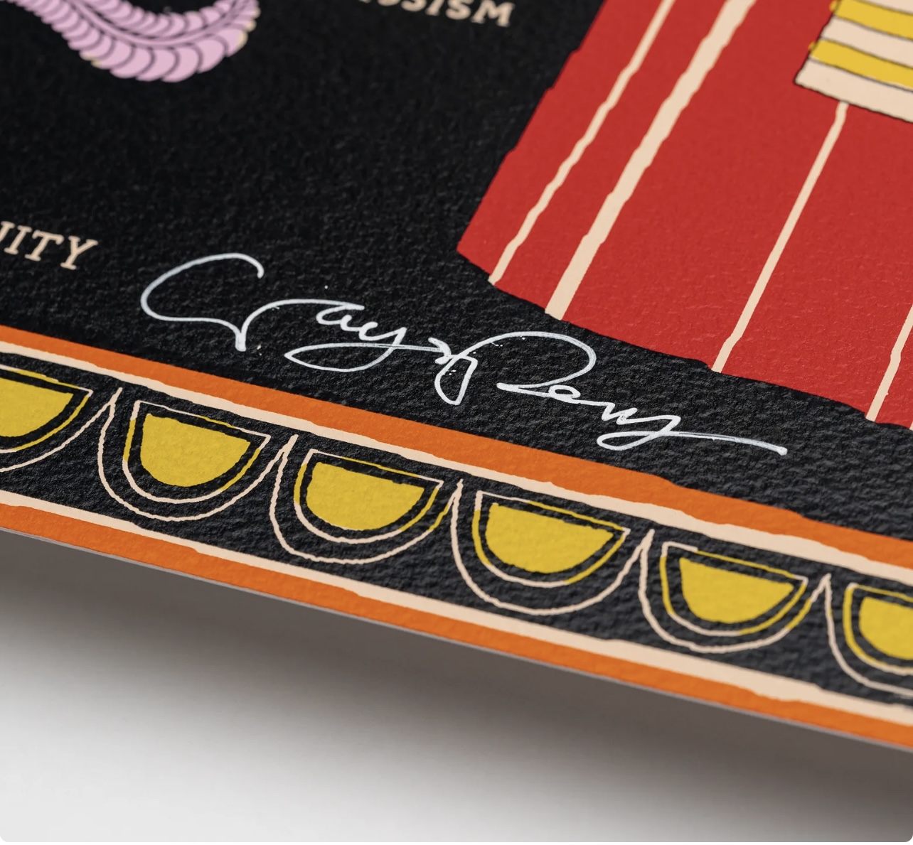 Grayson worked closely with printmakers at Make-Ready in London to bring his vision to life. The result is a tactile silkscreen on bespoke textured paper with intentional irregularities – an homage to traditions from centuries ago, and a celebration of modern silkscreen printing.